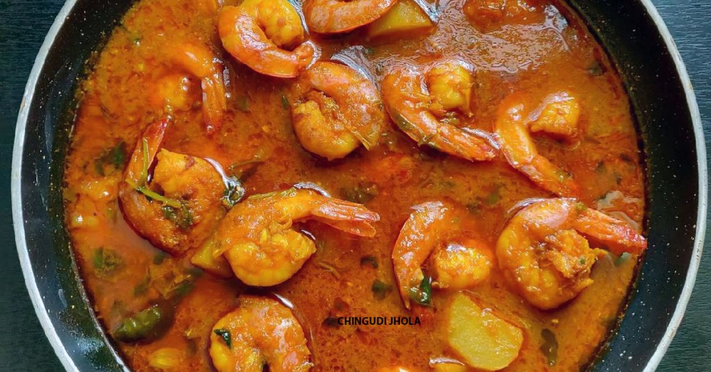 Oriya style prawn curry which is also called chingudi jhola in oriya is a very delicious recipe. Goes well with steamed rice. It is a spicy gravy based prawn curry with different flavours of spices. It is mostly eaten by people of the coastal regions and the areas of River basins of Odisha, India.