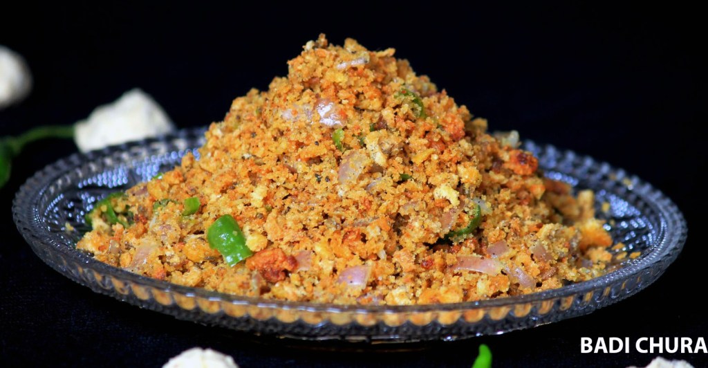 The badi chura is an authentic recipe of Odisha state. Badi is sun-dried lentil dumpling and chura means a coarse mixture of badi, spices & flavours like onion, garlic, green chilli along with mustard oil. Traditionally, soaked black gram or urad dal was grinded to a paste along with some water. Then these dumplings are sundried. Usually these are made in fall and stored away for entire year.